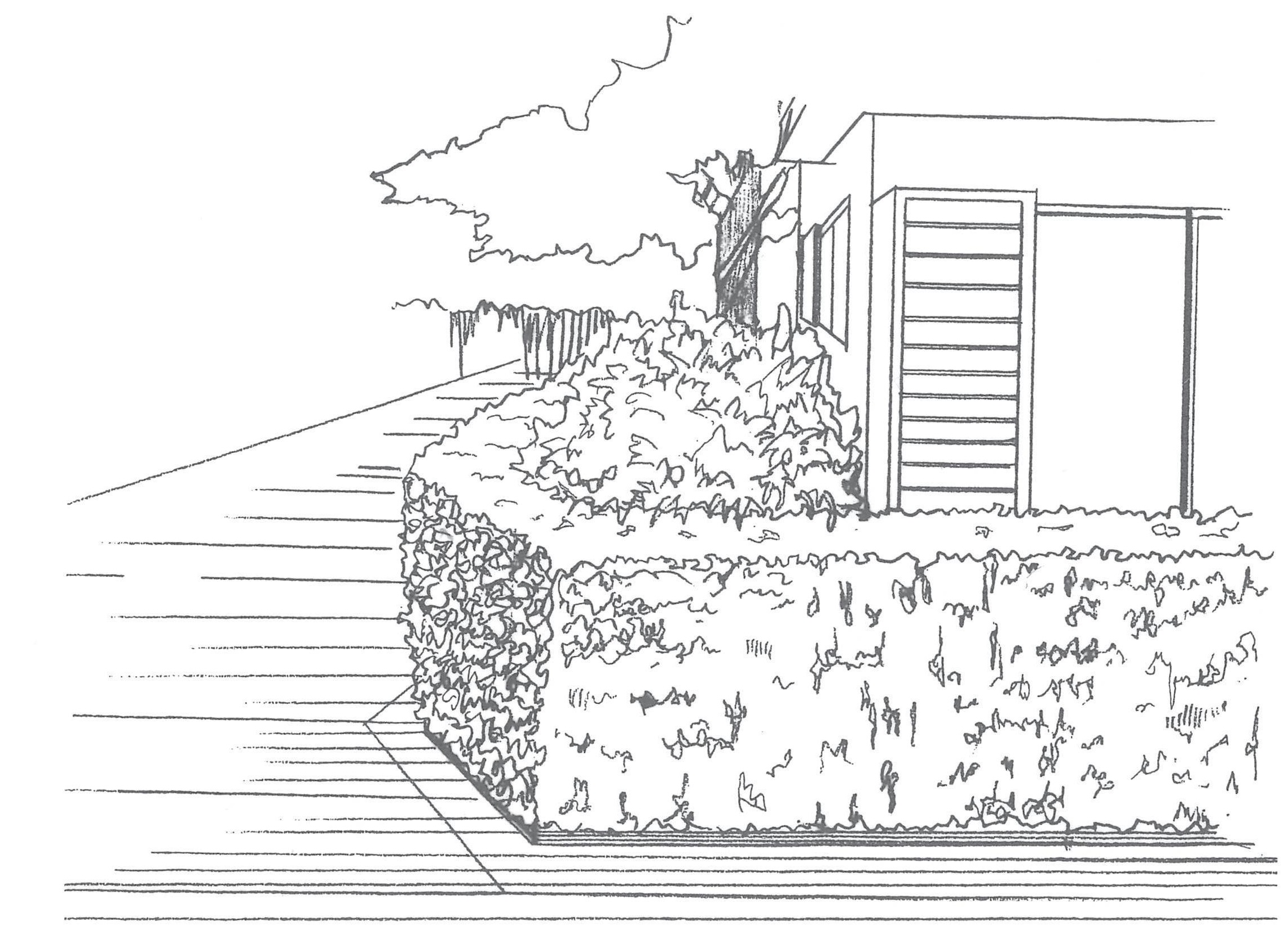 ■工場・倉庫等の用途として住居系用途地域(A-1地区、A-2地区、B地区、C地区)に隣接する場合、又は道路を挟んで面する場合の垣又はさくの構造は、敷地境界線若しくは道路境界線より幅1.0m以上の植栽帯を設け、その内側に高さ1.5m以上の目隠しフェンス等とします。