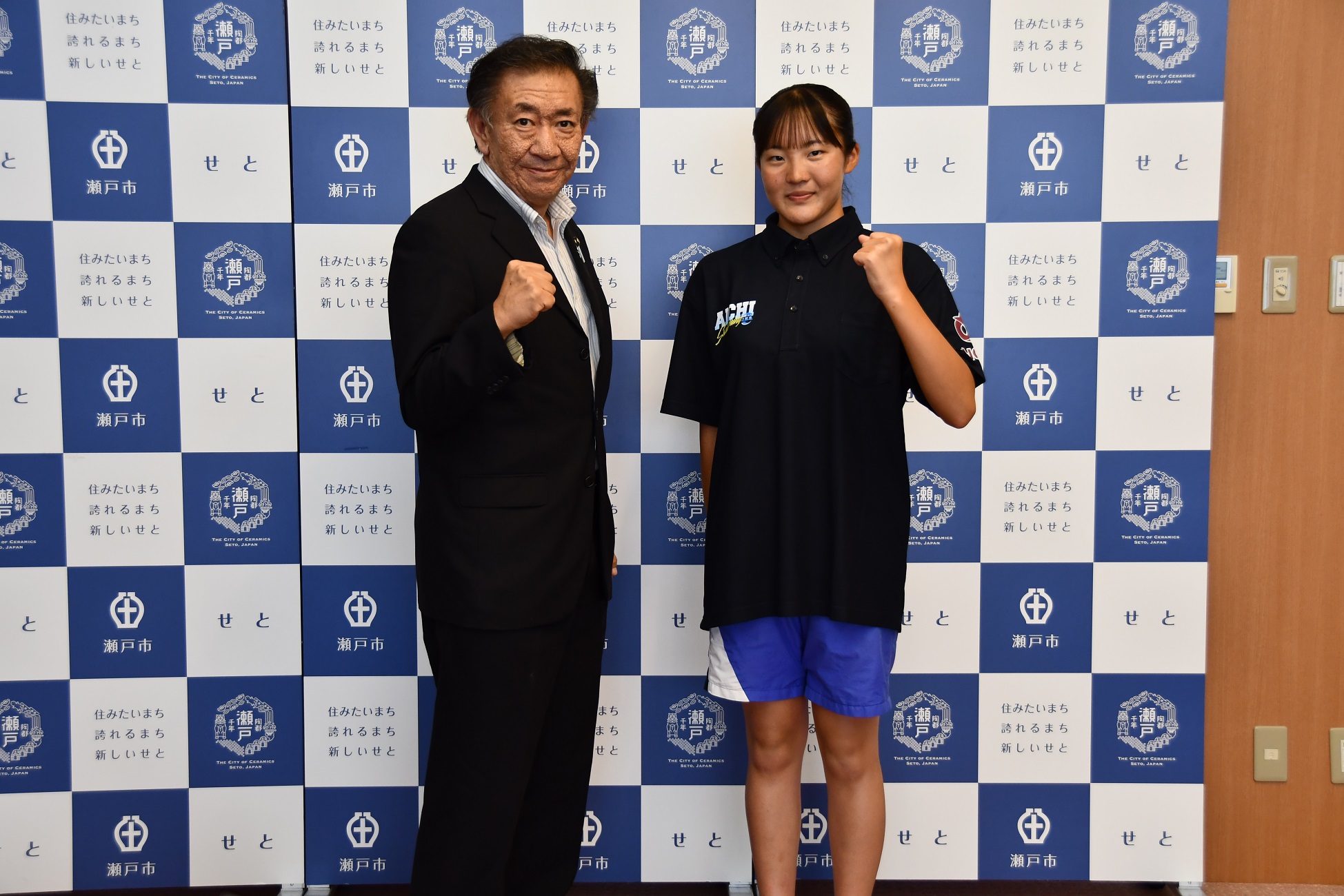 南山中学校3年生の猪又 彩(いのまた あや)さんが第63回全国中学校水泳競技大会に出場するため、その報告に来てくださいました。