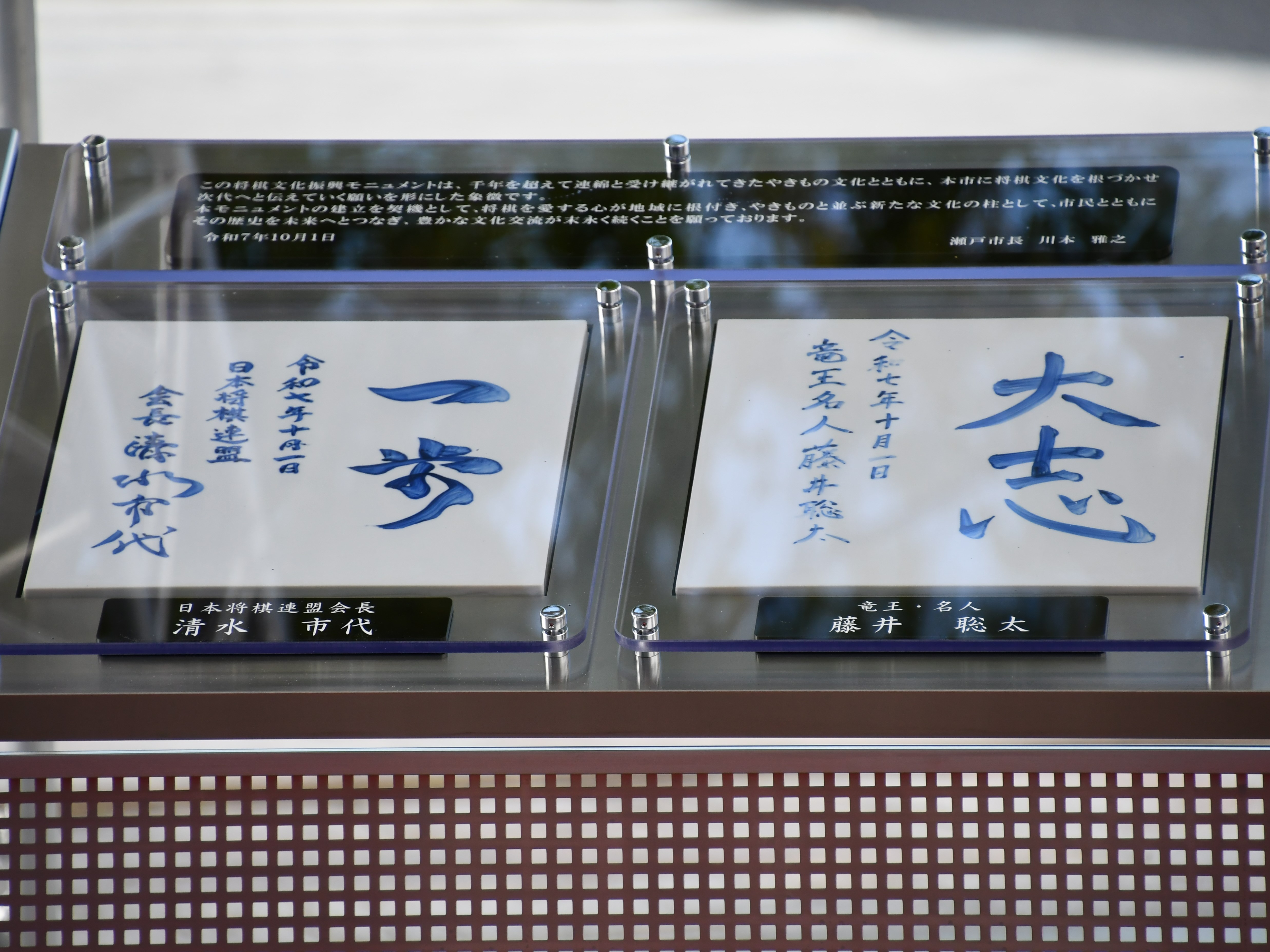 「やきもの文化」と同様に「将棋文化」を瀬戸市に根付かせ次世代に引き継ぐため、パルティせとの北側に将棋文化振興モニュメントを設置しました。あわせて、銘板へ清水会長及び藤井総太竜王・名人の揮毫をいただきました。瀬戸市にとって将棋文化振興は新しい挑戦です。このモニュメントが新たな瀬戸の文化の象徴として、末永く市民に親しまれることを願います。