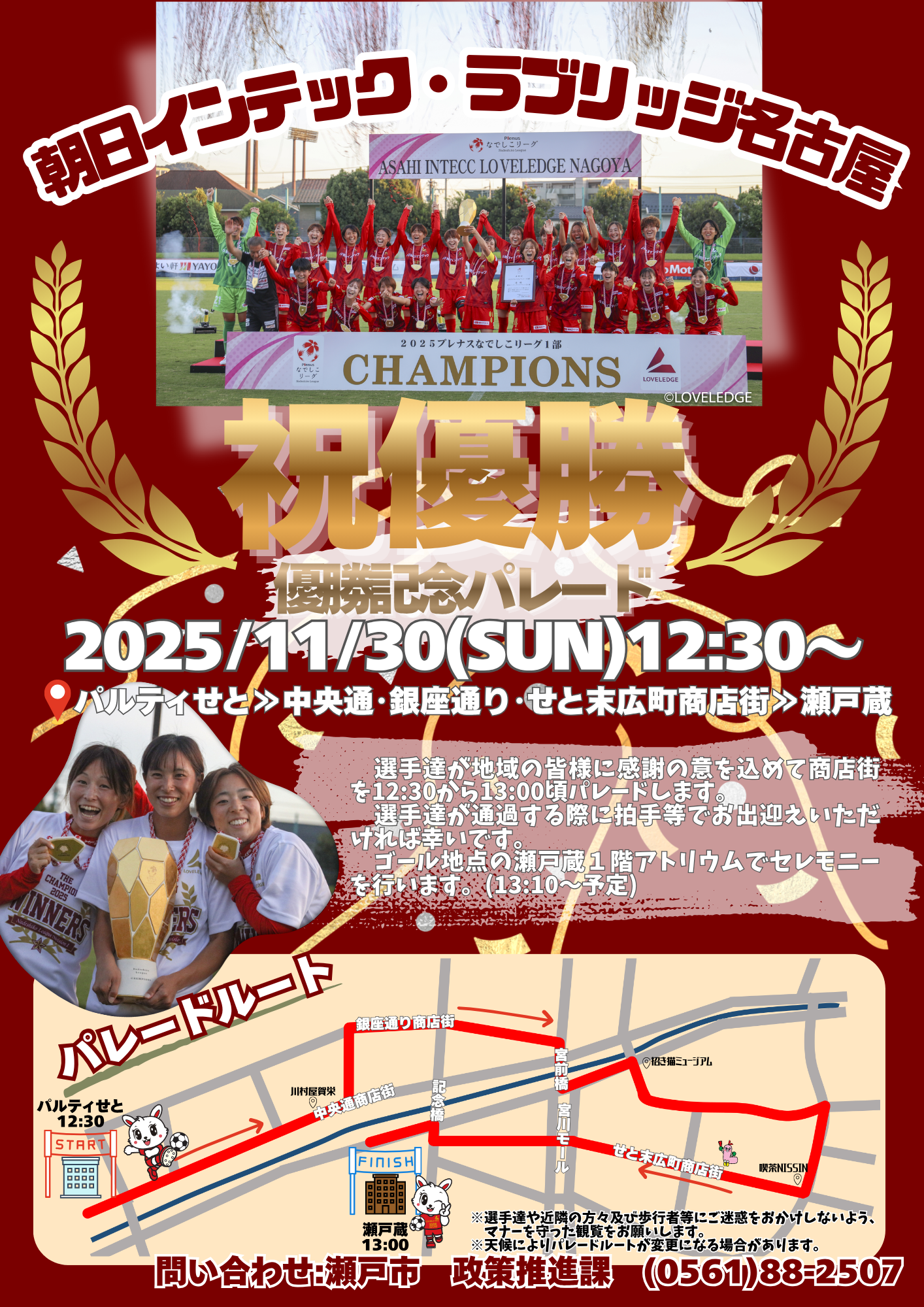 瀬戸市と包括連携協定を締結している、朝日インテック・ラブリッジ名古屋が2025プレナスなでしこリーグ1部で初優勝をおさめました!