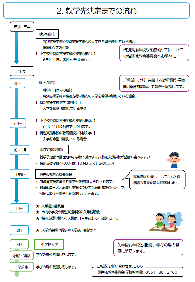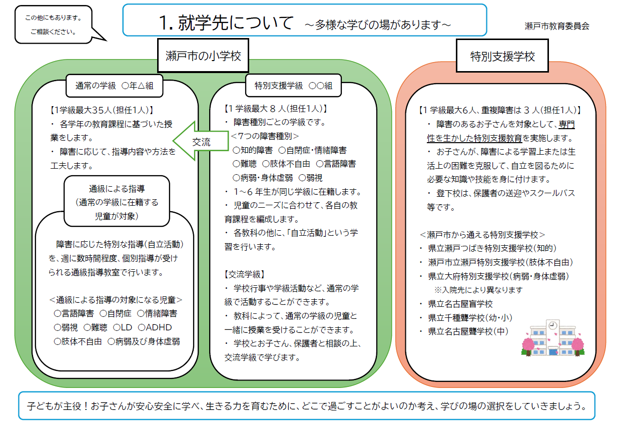 教育委員会では、発達の面で少し気になる様子があるお子さんや障害があるお子さんが、それぞれのお子さんにとって適した就学先で学んでいただけるよう取り組んでおります。気になることがありましたら、お気軽にご相談ください。