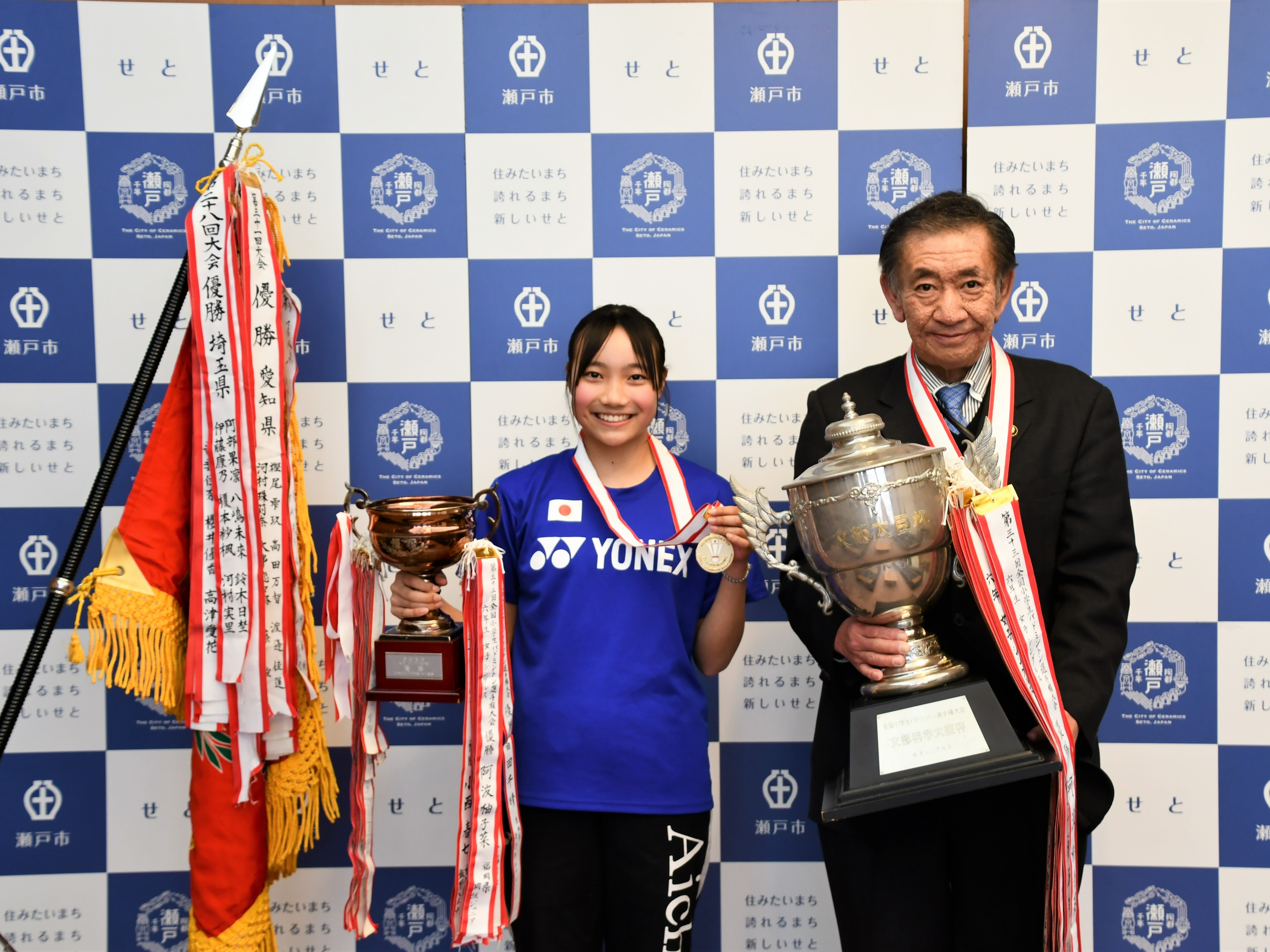第34回全国バドミントン選手権大会で、団体戦・個人戦ともに優勝した東山小学校6年生の渡邊世怜菜さんが報告に来てくれました。現在、ナショナルチームにも選抜されている渡邊さんは、「いつか世界一になりたい。」と話してくれました。世界で活躍されることを期待しています。