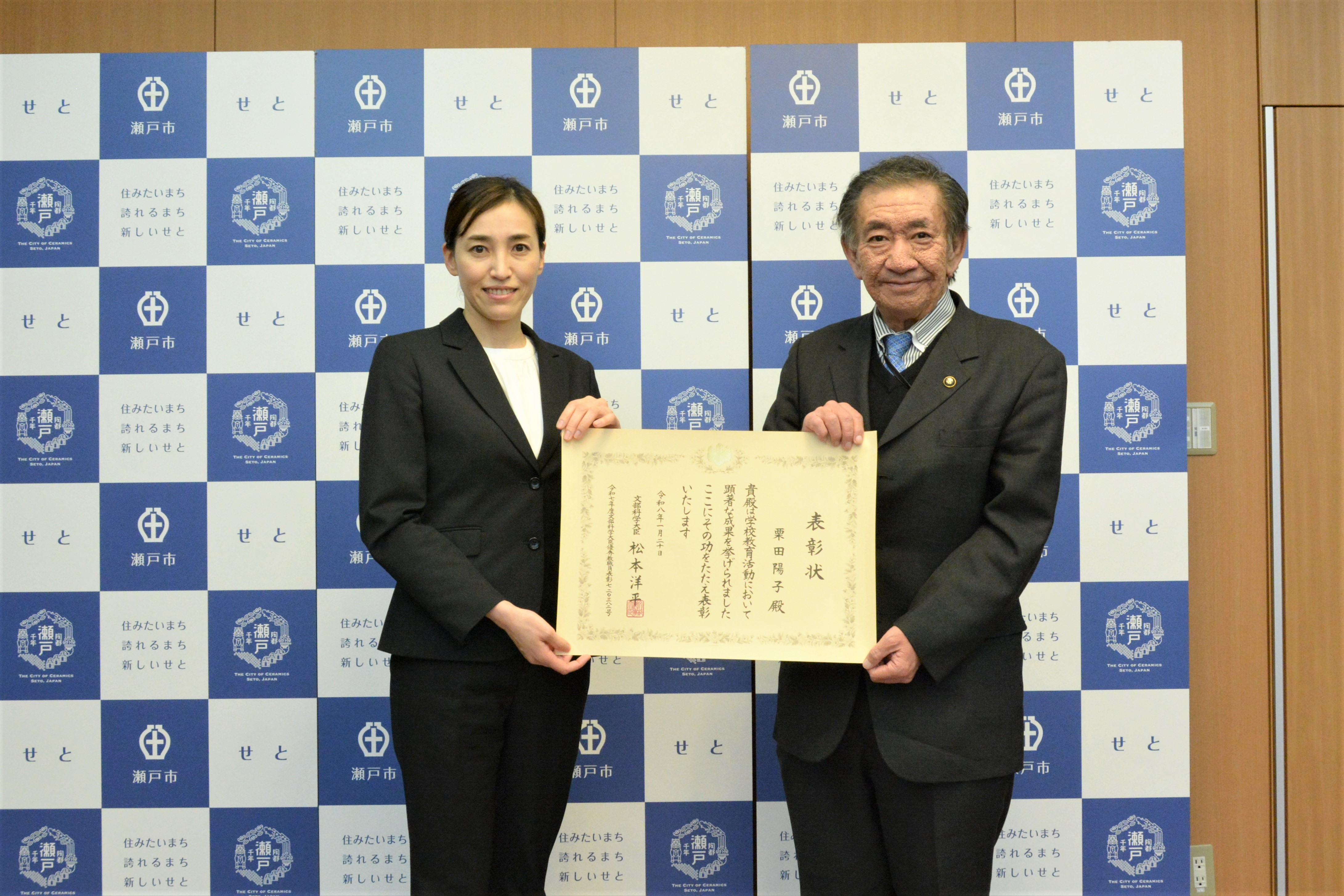 令和7年度文部科学大臣優秀教職員表彰を品野中学校の栗田陽子先生が受賞されました。栄養教諭として食育など給食指導に尽力したことが評価されました。先生や生徒とコミュニケーションをとり、食の大切さをわかりやすく子どもたちに伝えています。これからも体の基本となる食の重要性を子どもたちに伝え続けてください。