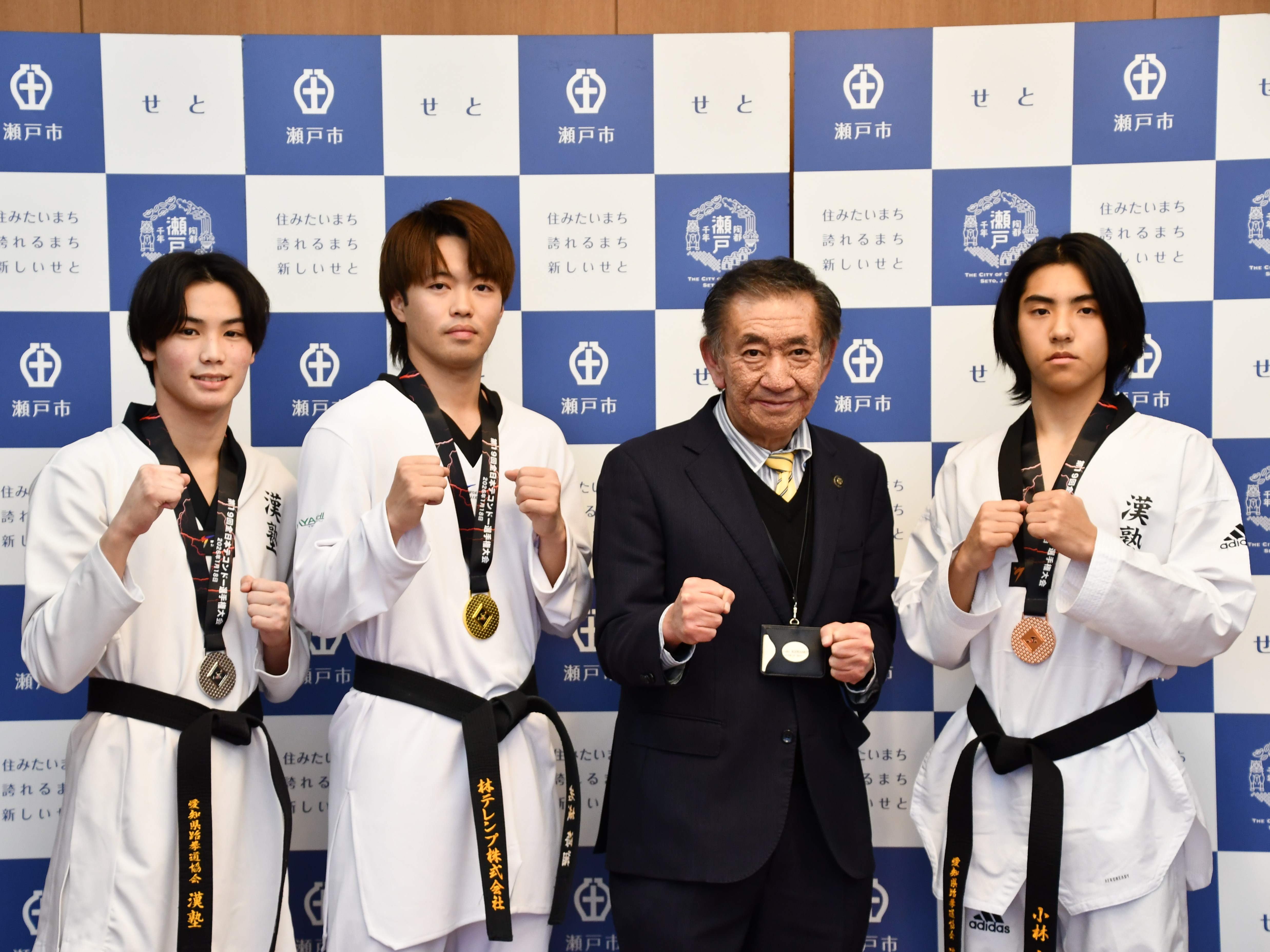 瀬戸市内のテコンドー道場「漢塾」の岩城海翔さん(男子-68kg 1位)、岡崎誠二さん(男子-54kg 2位)、小林大雅さん(男子-58kg 3位)と、師範代の山田勇摩コーチが全日本テコンドー選手権大会の結果報告に来てくださいました。怪我に気を付けて稽古に励んでください。