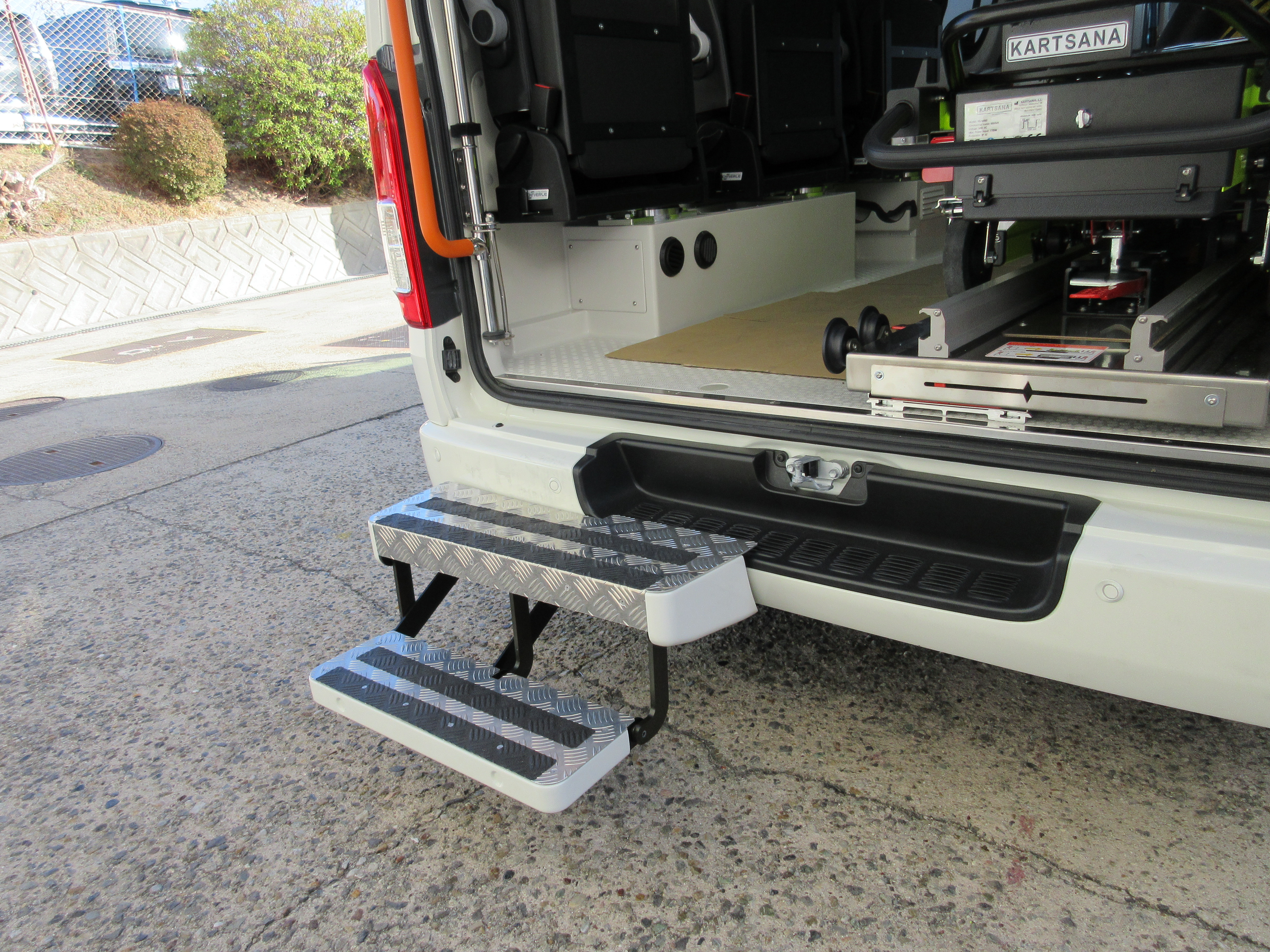 この車両は、平成27年から10年間にわたって活躍した車両等の老朽化に伴い更新したもので、ベルリング社製のC-CABINを初めて導入しました。車両特徴としては、足廻りにショックアブソーバーを搭載し、揺れ軽減を図り、後部には電動2段ステップを設置し、高齢者の方でも負担なく安全に乗降車できるようにしました。
