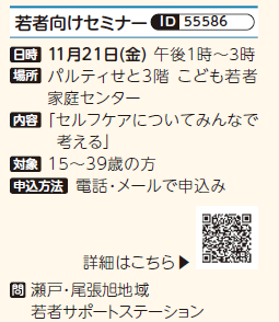 | 若者向けセミナー「セルフケアについてみんなで考える」 | 11月21日(金曜) | 瀬戸・尾張旭地域若者サポートステーション(070-1374-3329) |