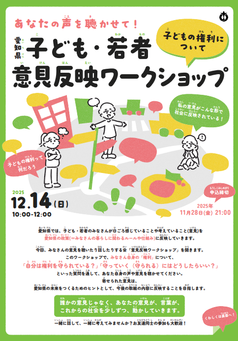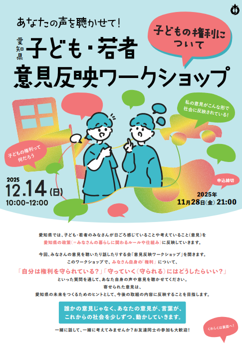 愛知県では、子ども・若者のみなさんが日ごろ感じていることや考えていること(意見)を 愛知県の政策(=みなさんの暮らしに関わるルールや仕組み)に反映していきます。 今回、みなさんの意見を聴いたり話したりする会「意見反映ワークショップ」を開きます。 このワークショップで、みなさん自身の「権利」について、 「自分は権利を守られている?」「守っていく(守られる)にはどうしたらいい?」といった質問を通して、あなた自身の声や意見を聴かせてください。 寄せられた意見は、 愛知県の未来をつくるためのヒントとして、今後の取組の内容に反映することを目指します。
