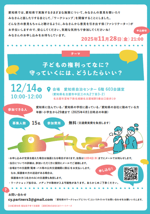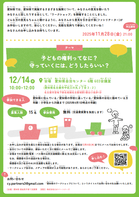お問い合わせ cy.partners3@gmail.com 「愛知県のワークショップについて」というタイトルでお問い合わせをお願いいたします。